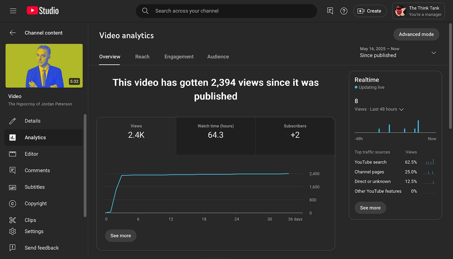 This experience has taught me a valuable lesson: no half measures when presenting an argument publicly. When writing the video, I naively presumed the audience would already be somewhat in agreement with the video’s central premise and consider my argument a succinct illumination of Peterson's rhetorical hypocrisy (hence why the video is relatively short and uses few examples). I was not as rigorous in my argument as I should have been.